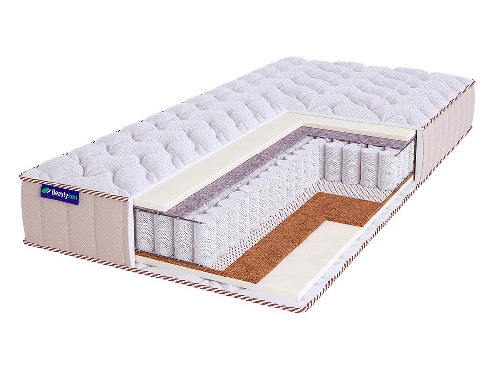 Основа модели Promo Lux 5 S600, изготовлена из блока автономных пружин TFK и усилена пенным коробом по периметру. Пружины размещены по поверхности с большой частотой, точечно реагируют на вес спящего, не провисают, не скрипят под нагрузкой. Обе стороны матраса дополнены слоями из эластичной анатомической пены AirFoam, прослойка одной из сторон дополнена латексированной койрой кокоса. Кокос выравнивает спальную поверхность, добавляет жесткости и ортопедических свойств. Пена смягчает, добавляет упругости и комфорта. Матрас с разными по жесткости сторонами и достаточно большой устойчивости к нагрузкам. Изделие оценят разновесные пары и люди со значительной массой тела. ЧехолЧехол пошит из прочного трикотажного полотна с пышной стежкой на ППУ и синтепоне. Чехол надежно защищает от износа и загрязнений, плотно обтягивает матрас, не сминается. Интернет-магазин TOP-MATRAS.RU официально представляет марку Beautyson на территории Москвы, Московской области и всей России. Мы соблюдаем ценовую политику брэнда Beautyson, но готовы сделать индивидуальное ценовое предложения для наших клиентов. Кроме того, только у нас вы сможете выгодно и быстро купить матрас Beautyson Promo Lux 5 S600 в любом нестандартном размере, с доставкой по городу Москва. Матрас Beautyson Promo Lux 5 S600 размером 60 х 190 по цене — 20205 р. Успейте купить со скидкой 30%. Срок акции - с 15-10-2025 по 29-10-2025 Срок распродажи и количество товара ограничены. Действующая цена со скидкой 20205 р. Ваша экономия составит -20205 р. Для заказа матраса в Москве или Московской области звоните: +7 (800) 777-05-32