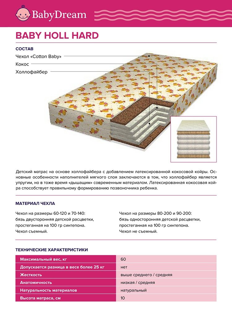 Ортопедический детский матрас из холлофайбера и кокосовой койры. Симметричный жесткий матрас из современного материала холлофайбер с добавлением кокосовой койры высотой 10 см. Холлофайбер - плотный, гипоаллергенный, износоустойчивый материал, хорошо вентилируется и не впитывает запахи. По обеим сторонам холлофайбер обрамлен кокосом, что добавляет ему жесткости и ортопедического эффекта. Матрас жесткий, с хорошими ортопедическими свойствами. ЧехолЧехол выполнен из хлопчатобумажной двусторонней ткани, простеганной на 200 гр гипоаллергенного холлкона. Чехол плотный, износоустойчивый, приятный на ощупь. Рисунок на ткани может отличаться от представленного на фото. Интернет-магазин TOP-MATRAS.RU официально представляет марку Dreamline на территории Москвы, Московской области и всей России. Мы соблюдаем ценовую политику брэнда Dreamline, но готовы сделать индивидуальное ценовое предложения для наших клиентов. Кроме того, только у нас вы сможете выгодно и быстро купить матрас Dreamline Baby Holl Hard в любом нестандартном размере, с доставкой по городу Москва. Детский матрас Dreamline Baby Holl Hard размером 60 х 110 по цене — 5383 р. Успейте купить со скидкой 30%. Срок акции - с 14-10-2025 по 28-10-2025 Срок распродажи и количество товара ограничены. Действующая цена со скидкой 5383 р. Ваша экономия составит -5383 р. Для заказа детского матраса в Москве или Московской области звоните: +7 (800) 777-05-32