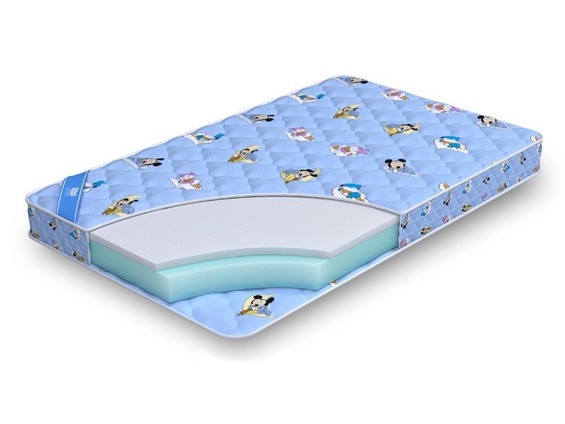 Упругий пенополиуретан проложен по стороне со средней жёсткостью. Гибкий материал подстраивается под контуры тела малыша. Быстро восстанавливает свою первоначальную форму после интенсивных нагрузок.
