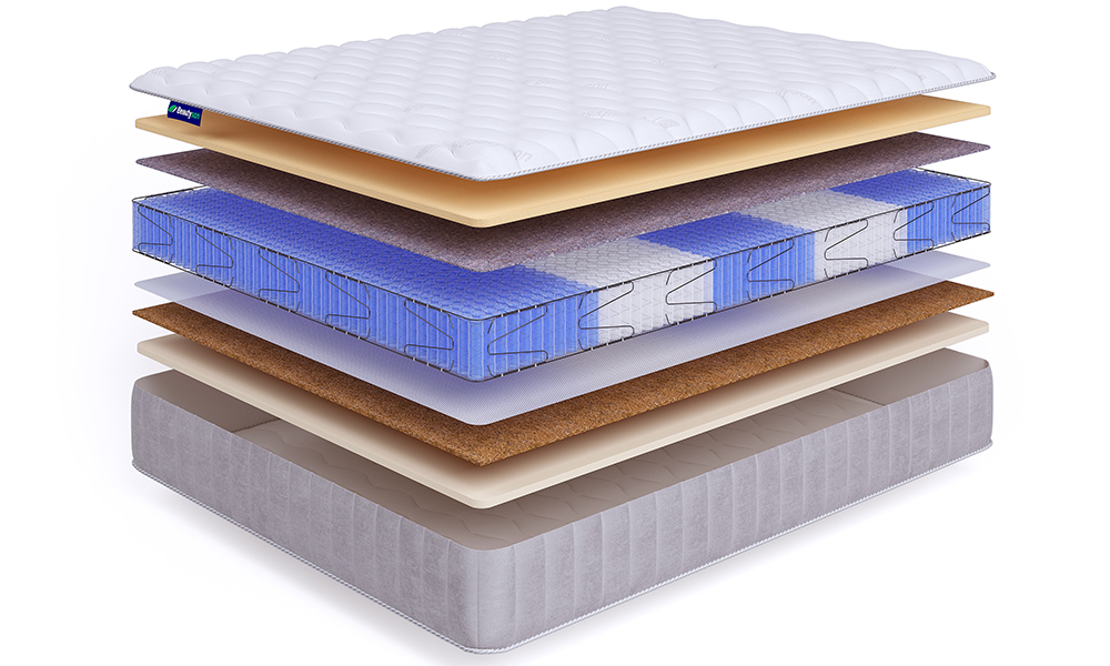 - Кокосовая койра: Натуральный материал из кокосовых волокон, пропитанных латексом. Придает матрасу дополнительную жесткость и упругость, улучшая его ортопедические свойства и обеспечивая правильное положение позвоночника во время сна.