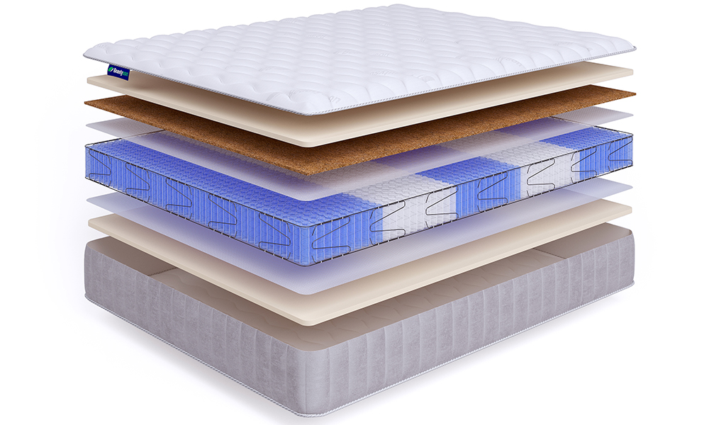 - Кокосовая койра: Натуральный материал из волокон кокосового ореха, пропитанных латексом. Придает матрасу дополнительную жесткость и упругость, улучшая его ортопедические свойства и обеспечивая оптимальную поддержку во время сна.