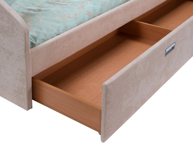 Главное достоинство данной модели кровати – наличие вместительных выдвижных ящиков, что дает возможность выделить место для хранения постельных принадлежностей или других вещей, не используя дополнительное пространство. Вне зависимости от размеров кровати глубина выдвижных ящиков составляет всегда 58 см. Аккуратный и компактный дизайн дает возможность разместить кровать данной модели не только в спальне, но и в небольшой квартире в качестве диванчика. Кровать Орматек Bono изготовлена из ДСП, который прослужит долго и надежно. Поверхности имеют обивку из экокожи премиум-класса, которая с легкостью выдерживает перепады температур и влажности в нашем регионе. Как вариант для обивки может использоваться мебельная ткань.
