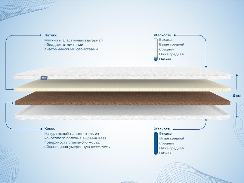 Двусторонний ортопедический наматрасник из натурального латекса и кокоса высотой 6 см. Наматрасник изготовлен из натурального латекса и натуральной кокосовой койры. Натуральный латекс - материал мягкий, эластичный, гипоаллергенный, экологически чистый. Кокосовая койра - жесткий, дышащий, натуральный материал, с отличным ортопедическим эффектом. Наматрасник из натурального латекса и кокоса надежный и долговечный, обладает отличными ортопедическими и анатомическими свойствами. Сгладит неровности и смягчит спальное место с одной стороны, добавит жесткости с другой. ЧехолЧехол наматрасника выполнен из жаккарда. Жаккард - это прочная, износоустойчивая ткань, с рельефным эстетичным рисунком. Интернет-магазин TOP-MATRAS.RU официально представляет марку Dimax на территории Москвы, Московской области и всей России. Мы соблюдаем ценовую политику брэнда Dimax, но готовы сделать индивидуальное ценовое предложения для наших клиентов. Кроме того, только у нас вы сможете выгодно и быстро купить матрас Dimax Латекс кокос Dimax в любом нестандартном размере, с доставкой по городу Москва. Наматрасник Dimax Латекс кокос Dimax размером 60 х 120 по цене — 11909 р. Успейте купить со скидкой 30%. Срок акции - с 15-10-2025 по 29-10-2025 Срок распродажи и количество товара ограничены. Действующая цена со скидкой 11909 р. Ваша экономия составит -11909 р. Для заказа наматрасника в Москве или Московской области звоните: +7 (800) 777-05-32