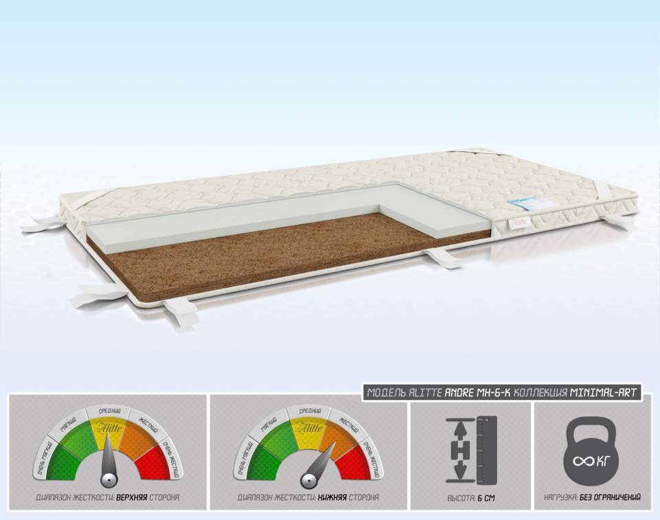 Ортопедический топпер Andre MH-6-K или тонкий матрас, изготовлен из комбинации натуральной койры кокоса и искусственного латекса. Наполнители прекрасно дополняют друг друга усиливая свойства. Наматрасник выравнивает поверхность, сглаживает стыки и неровности, изменяет уровень упругости и жесткости, может использоваться как самостоятельное спальное место. Изделие оказывает профилактическое воздействие на позвоночник, расслабляет мышцы и ткани. Наполнители гигиеничны, безопасны, хорошо вентилируются и не скапливают пыль и влагу. Наматрасник средней жесткости и умерено жесткости. ЧехолЧехол пошит из прочной жаккардовой ткани на основе хлопка. Чехол надежно защищает наполнители от негативного воздействия влаги и окружающей среды. По краям изделия вшиты резинки для надежной фиксации на поверхности. ПреимуществаРазная жесткость сторон изделия; качественная природная койра кокоса и искусственный латекс в наполнении; боковые резинки или липучки для фиксации наматрасника. Интернет-магазин TOP-MATRAS.RU официально представляет марку Alitte на территории Москвы, Московской области и всей России. Мы соблюдаем ценовую политику брэнда Alitte, но готовы сделать индивидуальное ценовое предложения для наших клиентов. Кроме того, только у нас вы сможете выгодно и быстро купить матрас Alitte Andre MH-6-K в любом нестандартном размере, с доставкой по городу Москва. Наматрасник Alitte Andre MH-6-K размером 60 х 190 по цене — 7936 р. Успейте купить со скидкой 50%. Срок акции - с 15-10-2025 по 29-10-2025 Срок распродажи и количество товара ограничены. Действующая цена со скидкой 7936 р. Ваша экономия составит -7936 р. Для заказа наматрасника в Москве или Московской области звоните: +7 (800) 777-05-32