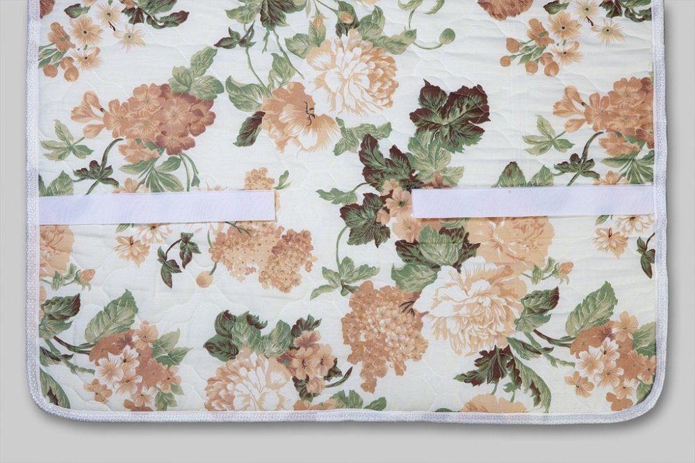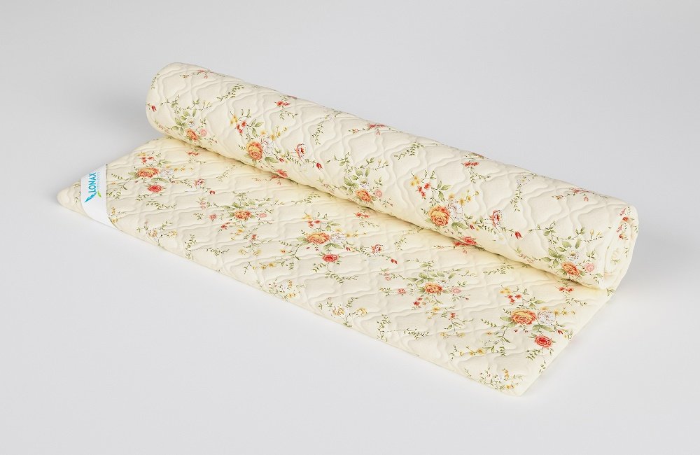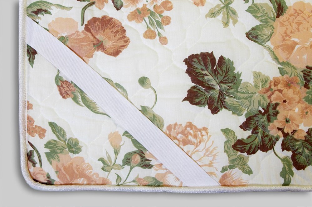 Выполнен из мягкого поликоттона. Дышащая ткань пропускает воздух и быстро отводит излишнюю влагу. Чехол дополнен пышным слоем синтепона 100 граммов на квадратный метр. По углам вшиты эластичные резинки для удобного крепления на спальную поверхность.
