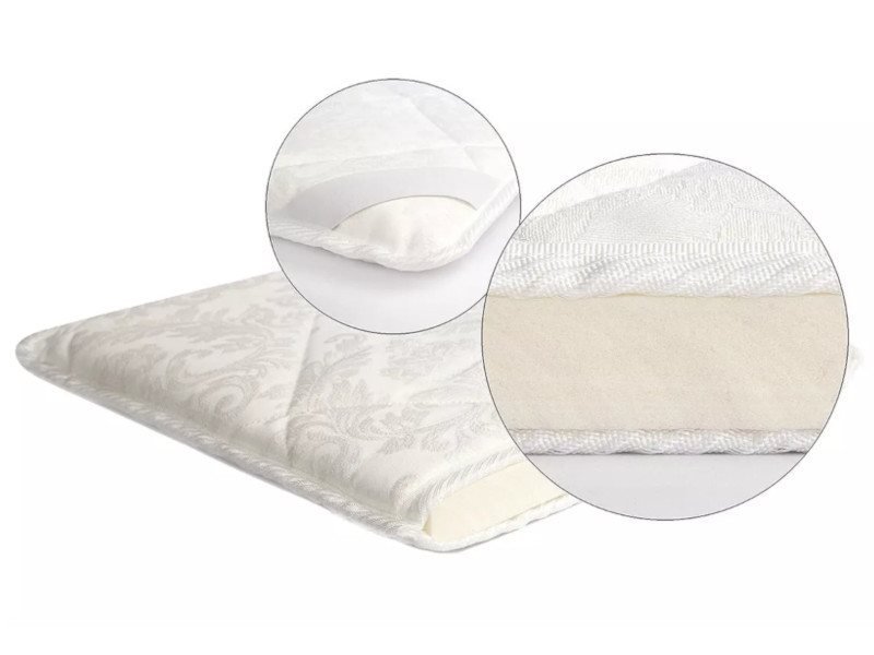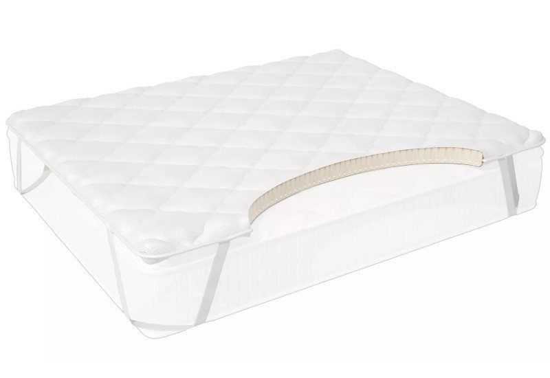 Покрывает топпер чехол из мягкого трикотажа. Ткань натуральная, приятная на ощупь. Изящества и комфорта придаёт пышная стёжка на синтепоне плотностью 300 г/м². С наматрасника не съезжают простыни. Они лежат ровно, не топорщатся. На нужное спальное место топпер крепится при помощи 4 широких резинок, пришитых по углам.