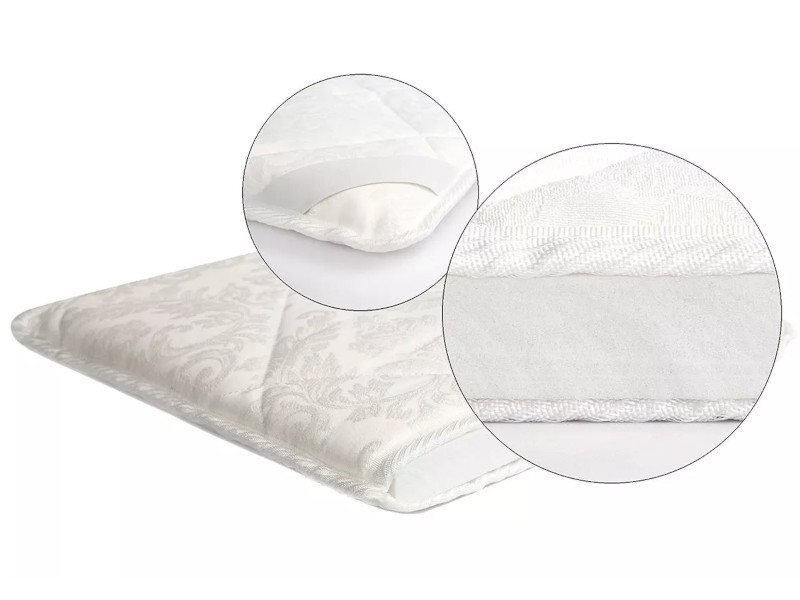 Чехол пошит из плотного жаккарда. Прочный материал не деформируется и не поддаётся зацепкам. Неприхотлив в уходе. Легко чистится. По углам пришиты широкие эластичные резинки, которые надёжно крепят наматрасник к нужной поверхности.