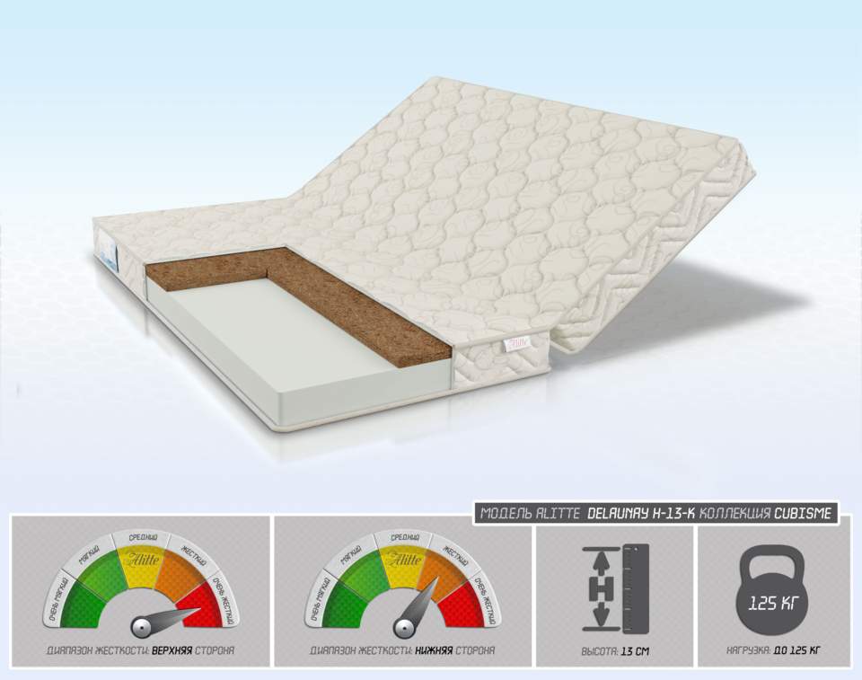 Двусторонний ортопедический матрас Delaunay H-13-K – универсальная складная модель. Подходит для постоянного или временного использования. При необходимости можно компактно сложить и убрать на хранение. Комфортность спального места достигается сочетанием слоёв кокосовой койры и искусственного латекса. Плита из кокоса, толщиной 3 сантиметра, образует ровную, твёрдую поверхность умеренной степени жёсткости. Не допускает образования прогибов в зонах, испытывающих наибольшую нагрузку. Создаёт условия для анатомически правильного расположения спины. Противоположная сторона средней жёсткости образована латексом. Гибкий, эластичный материал оперативно адаптируется к контурам спящего, снижает обратное давление поверхности на позвоночник и внутренние органы. ЧехолПрактичный жаккардовый чехол защищает наполнители от пыли и загрязнений. Ткань, изготовленная из хлопковых и синтетических нитей, износоустойчивая и неприхотливая в уходе. Интернет-магазин TOP-MATRAS.RU официально представляет марку Alitte на территории Москвы, Московской области и всей России. Мы соблюдаем ценовую политику брэнда Alitte, но готовы сделать индивидуальное ценовое предложения для наших клиентов. Кроме того, только у нас вы сможете выгодно и быстро купить матрас Alitte Delaunay H-13-K в любом нестандартном размере, с доставкой по городу Москва. Матрас Alitte Delaunay H-13-K размером 60 х 190 по цене — 9244 р. Успейте купить со скидкой 50%. Срок акции - с 16-10-2025 по 30-10-2025 Срок распродажи и количество товара ограничены. Действующая цена со скидкой 9244 р. Ваша экономия составит -9244 р. Для заказа матраса в Москве или Московской области звоните: +7 (800) 777-05-32