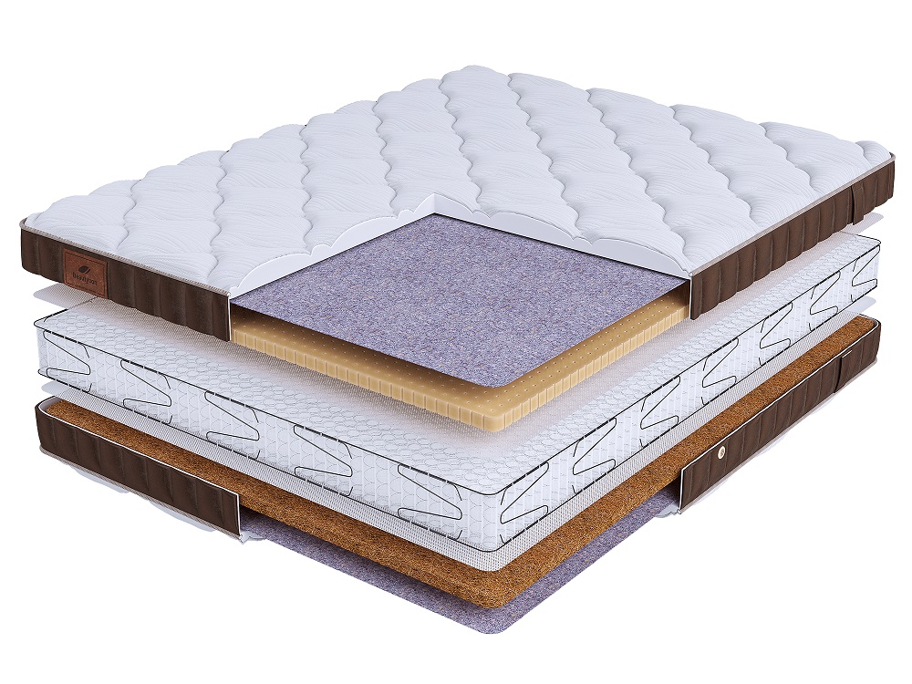 Блок с независимыми пружинами S1200 предлагает отличные ортопедические характеристики: они равномерно распределяют нагрузку, обеспечивают точечную поддержку и способствуют правильному положению тела во время сна. Использование инновационной бесклеевой технологии сборки позволило отказаться от поролонового короба и увеличить количество пружин на 50% по сравнению с аналогичными продуктами других брендов. В производстве используются только натуральные гипоаллергенные материалы, такие как латекс, кокосовая койра и хлопковое полотно. - ✅ Кокосовая койра — состоит из кокосовых волокон, пропитанных латексом. Этот материал известен своей износостойкостью, придаёт поверхности матраса упругость и жесткость, а также обладает отличными ортопедическими и эксплуатационными качествами.