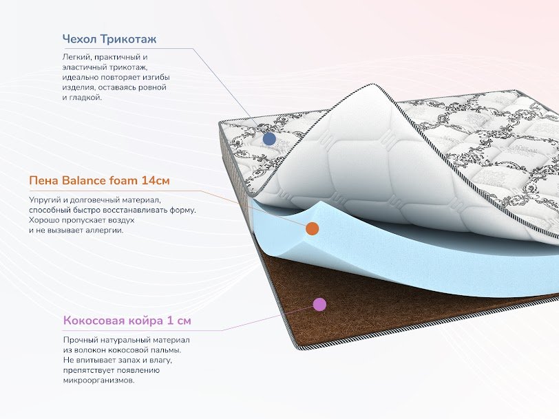 Двусторонний беспружинный матрас из пенополиуретана высотой 14 см и кокосовой койры 1 см. Матрас изготовлен из монолитного слоя пенополиуретана и дополнен слоем натуральной кокосовой койры с одной стороны. Пенополиуретан - материал мягкий, упругий, эластичный, гипоаллергенный. Матрас из пенополиуретана надежный и долговечный, отличный вариант для дачи или временного жилья. С одной стороны матрас умеренно жесткий за счет слоя кокоса, эта сторона ортопедичная. Для удобства матрас скручен с компактный ролл. ЧехолЧехол матраса выполнен из трикотажа, простеган на холлконе и ППУ. Чехол объемный, придает матрасу дополнительную мягкость и комфорт. Украшен оригинальным узором. Интернет-магазин TOP-MATRAS.RU официально представляет марку Dimax на территории Москвы, Московской области и всей России. Мы соблюдаем ценовую политику брэнда Dimax, но готовы сделать индивидуальное ценовое предложения для наших клиентов. Кроме того, только у нас вы сможете выгодно и быстро купить матрас Dimax Твист Ролл Симпл 15 в любом нестандартном размере, с доставкой по городу Москва. Матрас Dimax Твист Ролл Симпл 15 размером 60 х 190 по цене — 11915 р. Успейте купить со скидкой 40%. Срок акции - с 15-10-2025 по 29-10-2025 Срок распродажи и количество товара ограничены. Действующая цена со скидкой 11915 р. Ваша экономия составит -11915 р. Для заказа матраса в Москве или Московской области звоните: +7 (800) 777-05-32