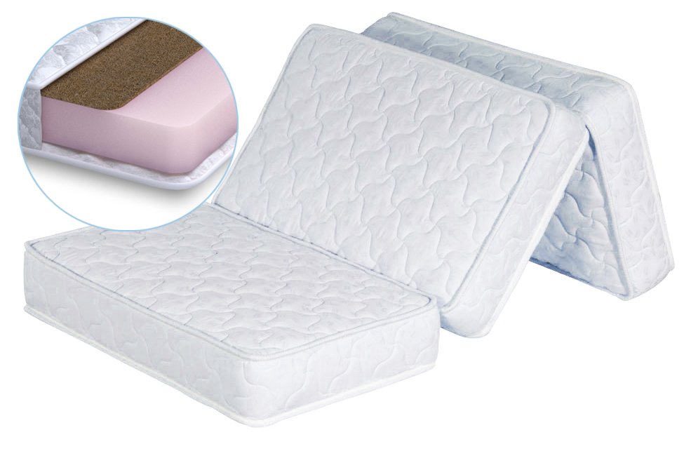 Матрас-трансформер из искусственного латекса и кокосовой койры с двумя сторонами жесткости. Невысокий, упругий, недорогой матрас из поролона повышенной плотности и кокоса подойдет для временного использования, для дивана, раскладушки или размещения гостей в квартире. Искусственный латекс - дышащий, гипоалергенный, средний по жесткости наполнитель. Смягчит спальное место, добавит комфорта. С одной стороны матрас дополнен слоем натурального, жесткого кокоса. Сторона средней умеренно жесткая, ортопедическая. Матрас состоит из трех частей, он компактно складывается и убирается при необходимости. По углам имеет липучки для надежной фиксации. ЧехолЧехол матраса выполнен из жаккарда, простеганного на гипоалергенном синтепоне. Стежка дает объем и дополнительный комфорт. Ткань приятная на ощупь и внешне.