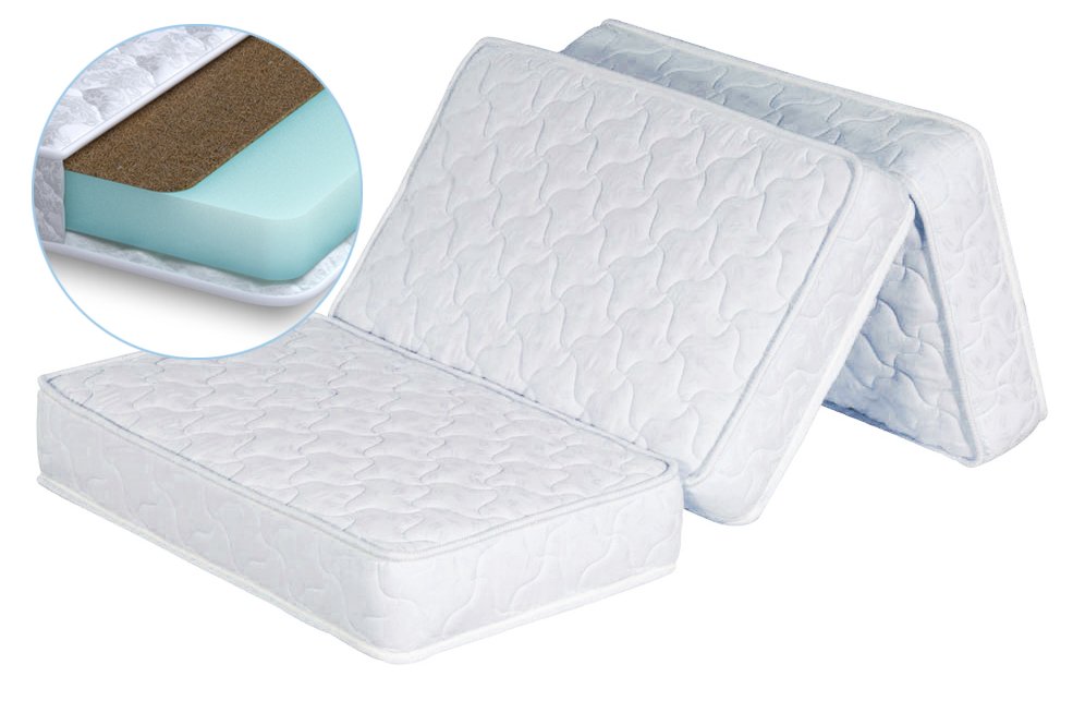 Матрас-трансформер из пенополиуретана и кокоса. Двусторонний, невысокий, недорогой матрас из поролона (пенополиуретан) и кокосового волокна подойдет для временного использования, для дивана, раскладушки или размещения гостей в квартире. Пенополиуретан - дышащий, гипоалергенный, мягкий наполнитель. Смягчит спальное место, добавит комфорта. С одной стороны матрас дополнен слоем натурального кокоса. Материал жесткий, упругий, обладает отличными ортопедическими свойствами. Матрас состоит из трех частей, он компактно складывается и убирается при необходимости. По углам имеет липучки для надежной фиксации. ЧехолЧехол матраса выполнен из жаккарда, простеганного на гипоалергенном синтепоне. Ткань приятная на ощупь и внешне. Стежка дает дополнительный объем и комфорт.